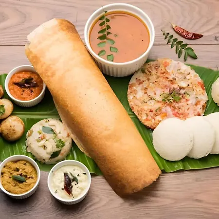 En vegetarisk frukost serveras på Arunsha Residency Hotell i Tiruvannāmalai varje morgon.